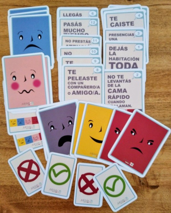 Este juego consta de tarjetas de "situaciones" y "emociones", las cuales se sacan alternándolas para dialogar sobre que emoción genera tal situación y así reflexionar que sería lo correcto.