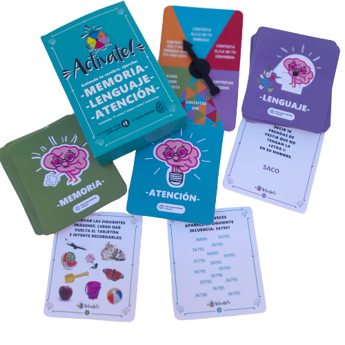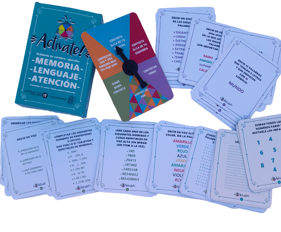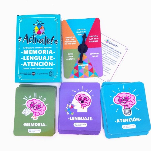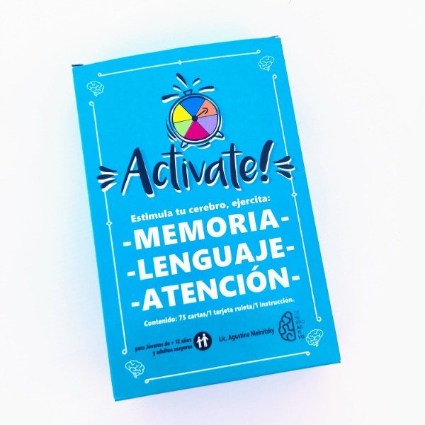 ACTIVATE!! es un juego de cartas "tarjetones" que propone la estimulación de los procesos cognitivos: memoria, lenguaje y atención principalmente, y también el entrenamiento de la velocidad de procesamiento, flexibilidad cognitiva, percepción, razonamiento, inhibición.