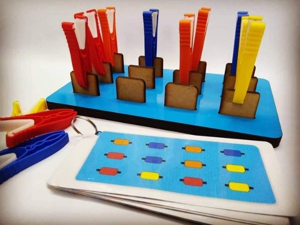 Contiene: 1 base de Mdf de 22 cm con 12 soportes, 12 broches plásticos de 4 colores y 12 tarjetas con propuestas.