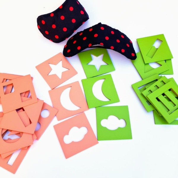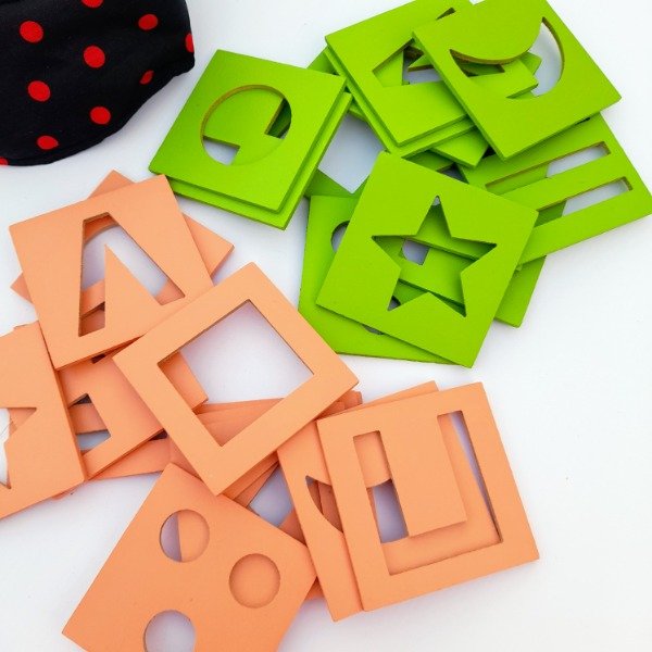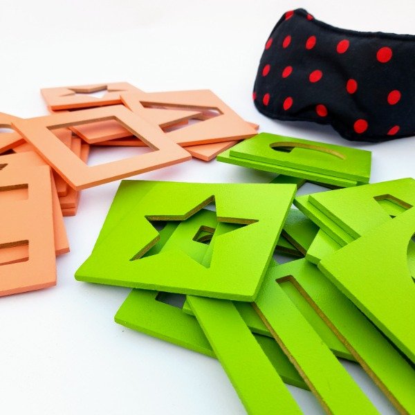 Contiene: 20 fichas de madera de 8x8 cm + oclusores para tapar los ojos.