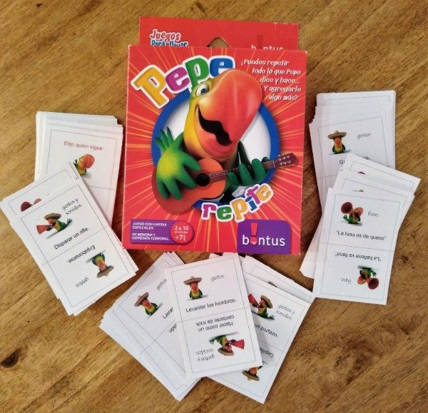 Contiene: un mazo con 82 cartas "pepe repite" con 164 actividades e instrucciones.