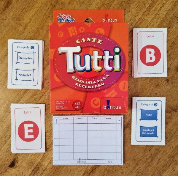 Tiene dos mazos de cartas, uno de "categorías" y uno de "letras", una talonario de anotación e instrucciones.