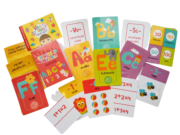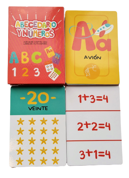 Contiene el abecedario completo y los números del 1 al 20. Viene con dos cartas con distintos juegos de observación que invitan a aprender utilizando los sentidos, la percepción y permiten que los niños tomen sus propias decisiones, cuando tienen que elegir objetos o participantes. Las cartas tienen un tamaño más grande que el de un naipe común, lo cual resulta muy atractivo para los niños y muy útil para enseñar en grupos. Son laminadas para su mayor duración, y tienen sus puntas redondeadas, lo que las hace apropiadas para la manipulación de los más chicos.