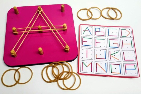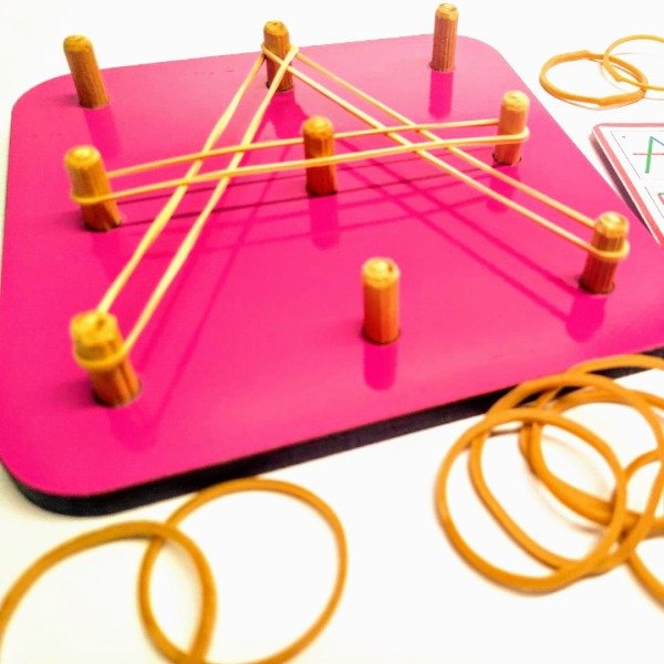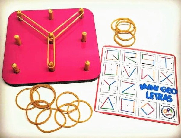 Contiene: 1 tablero de 12 cm de lado con 9 clavijas + banditas elásticas + tarjeta patrón indicando como construir cada letra.