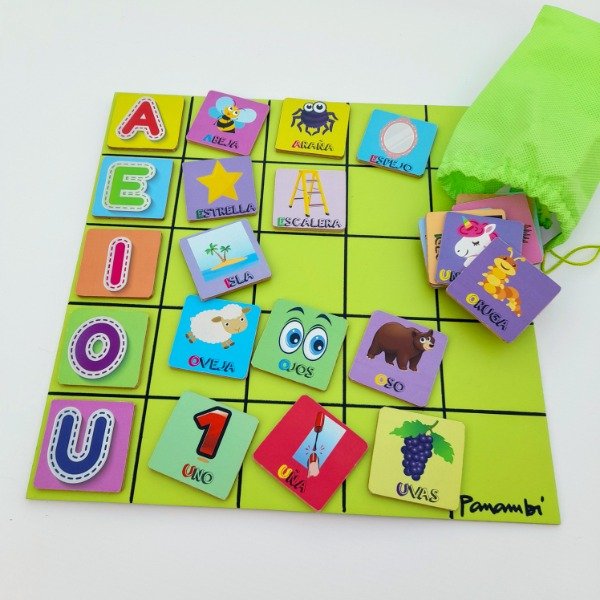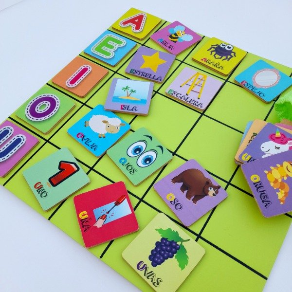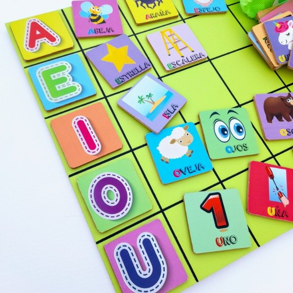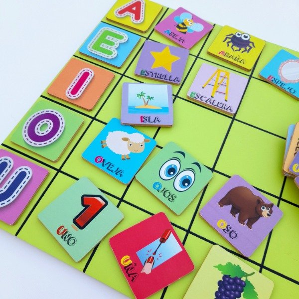Este recurso apunta al reconocimiento de las vocales, asociando la imagen a la primer primer letra de la palabra y así ubicándola en el casillero de la vocal correspondiente.