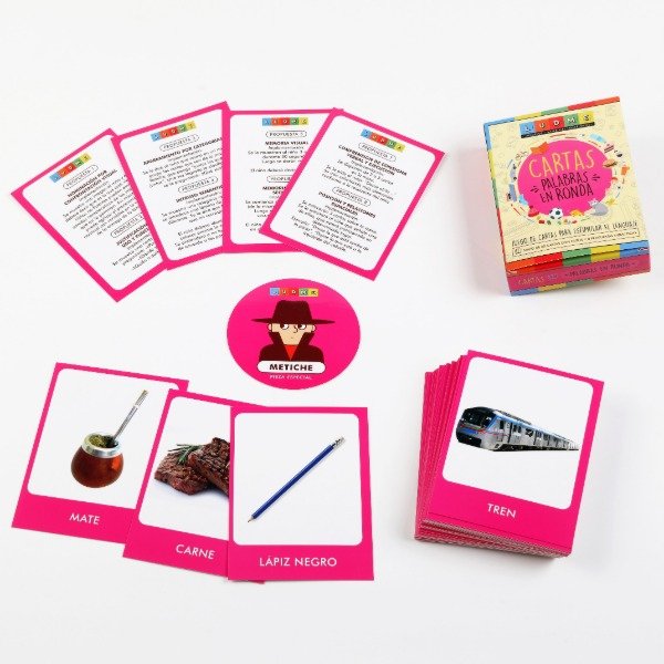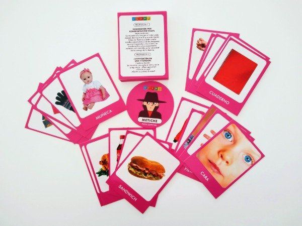 Contenido del juego: 57 cartas con imágenes reales en 8 categorías +1 carta "metiche" + 8 propuestas de trabajo