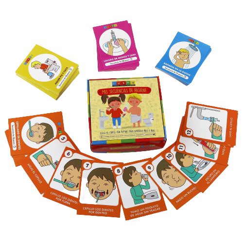 Este juego de cartas incluye 4 rutinas ( lavado de manos y cara, cepillado de dientes, bañarse en la ducha y hacer pis y caca) secuenciadas paso a paso.